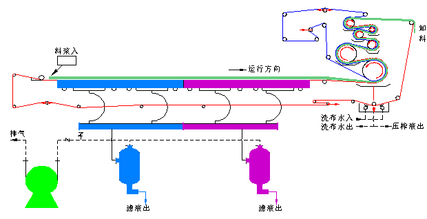 真空帶式壓榨過濾機(jī)是以濾帶為過濾介質(zhì),充分利用物料的重力、真空吸力、S形輥擠壓力實(shí)現(xiàn)固液分離的高效分離設(shè)備。采用整體可拆式過濾盤作為真空室,以S形擠壓輥?zhàn)鳛橥饬?,濾帶在電機(jī)拖動(dòng)下做連續(xù)運(yùn)行,過濾行程開始時(shí),濾盤在真空狀態(tài)下與濾帶同步運(yùn)行,在非真空狀態(tài)下濾盤與濾布作相對(duì)運(yùn)行。物料通過料漿分布器均布在真空濾盤的過濾帶上,濾帶上料漿在真空吸力的作用下進(jìn)行抽濾,直到真空濾盤碰到接近開關(guān)位置,下濾帶的濾餅在電機(jī)的拖動(dòng)下繼續(xù)運(yùn)行并進(jìn)入S形擠壓輥同時(shí)上濾帶在物料進(jìn)入S形擠壓輥后進(jìn)行擠壓以降低濾餅含濕量。過濾、洗滌、再過濾、擠壓后的濾餅經(jīng)刮刀裝置將濾餅剝離卸除,濾布經(jīng)自動(dòng)再生裝置清洗后,再經(jīng)過一組支承輥和糾偏裝置重新進(jìn)入過濾區(qū),集液罐濾液隨著濾盤返回同時(shí)排出,擠壓輥中的濾液流入收集盤。通過這樣周而復(fù)始的抽濾、洗滌、再抽濾、擠壓,從而實(shí)現(xiàn)固液分離的目的。